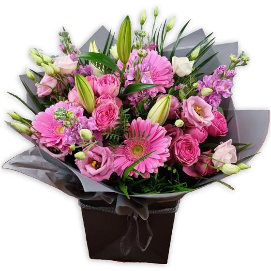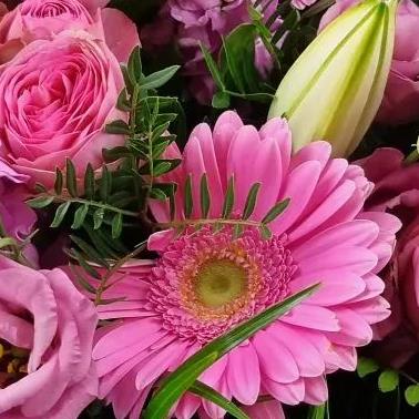 A graceful bouquet in shades of pink, combining pale lisianthus, blush rose sprays, soft gerberas and tender lilies, and feathery foliage, beautifully arranged in a chic box for a gentle touch.