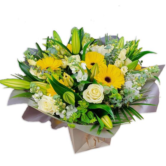 A fresh flower arrangement featuring gerbera, roses, lilies, stocks and seasonal foliage. Clean yellow and white tones are balanced with layered greenery to create a bright, uplifting design with a crisp, contemporary finish.