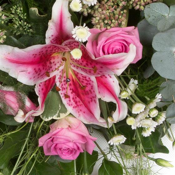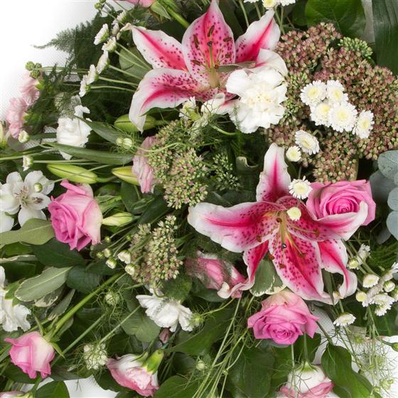 A pretty and feminine spray of pink and cream blooms including stargazer lilies, lisianthus and alstromeria